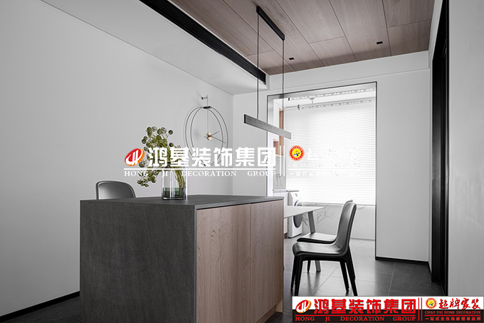 圖3.4.亮點:餐廳以獨特的條形吊燈和掛鐘來烘托空間氛圍,使用餐桌+島臺一起設計,這樣不僅可以擴展操作臺充當餐桌輔助,也可以作為作為閱讀辦公區(qū)域使用。廚房以實用為先,使用了常用的“L”型布局,充分利用拐角地帶,實現(xiàn)空間利用率的最大化。