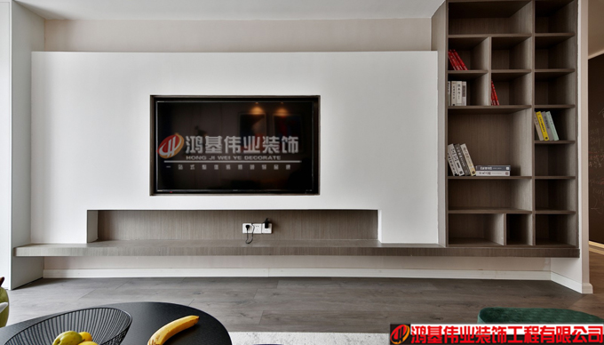 客廳電視背景墻是及收納的功能的,左邊是封閉式的柜子,右邊是開放式的書柜,電視做成了嵌入式的,讓空間更干凈。