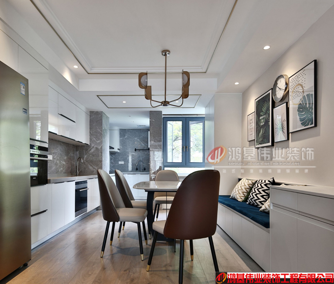 廚房和西廚的區(qū)域,空間不是很大,但是功能很強(qiáng),西廚有設(shè)計(jì)烤箱、洗碗機(jī)、冰箱、操作臺(tái),在吃飯之前洗個(gè)手,切個(gè)水果很方便。餐廳的卡座是定制的,因?yàn)椴蛷d的寬度不夠 所以設(shè)計(jì)了卡座來節(jié)約餐廳的空間,減少過道區(qū)域。