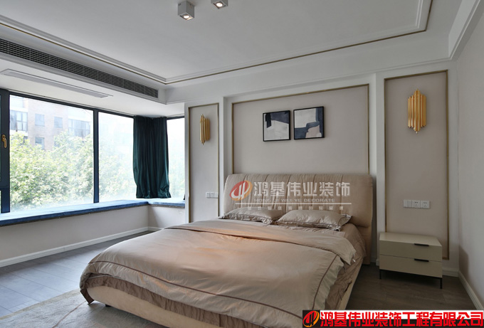 主臥室的頂也是原頂,四周吊了一個(gè)邊,鑲嵌了拉絲不銹鋼,床頭背景墻是石膏板做的,刷的實(shí)有色乳膠漆,邊是用了不銹鋼來收口。
